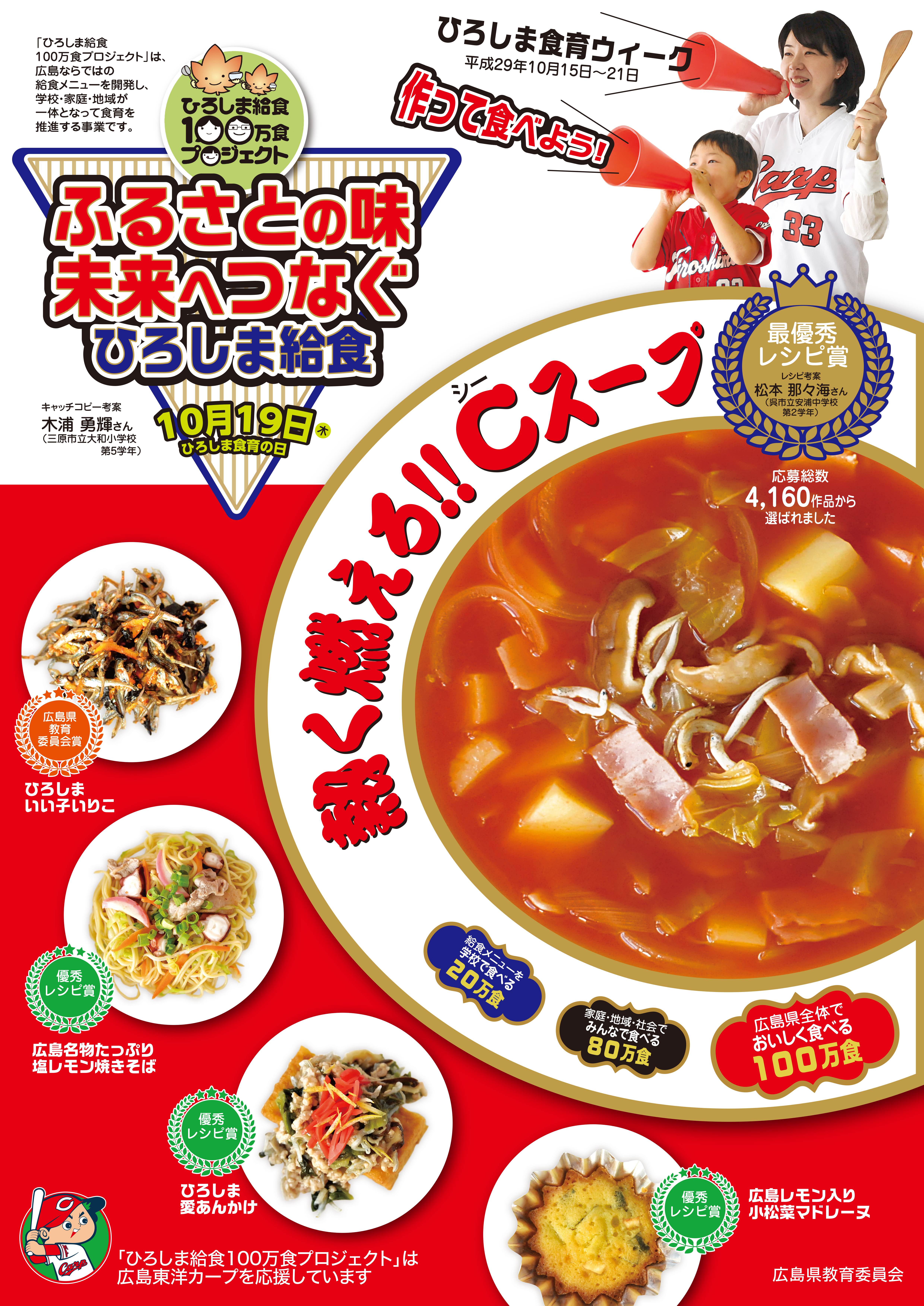 栄えある最優秀レシピ賞には『熱く燃えろ!!C(シー)スープ』が,広島県教育委員会賞には『ひろしまいい子いりこ』が輝きました。